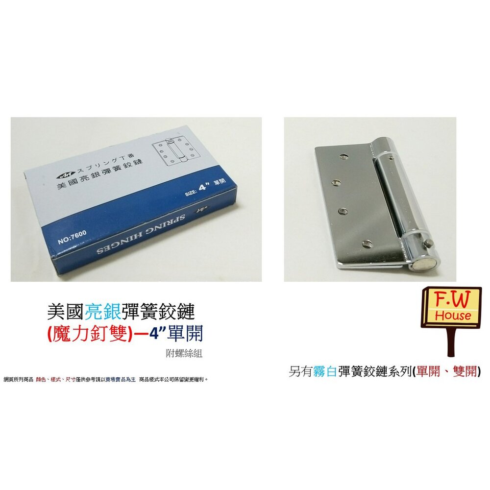 | 亮銀**單開** 4英吋 美國彈簧鉸鏈 | 現貨 916 件 |
